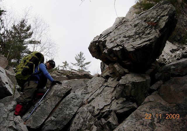 然后沿着约70度角立陡的山坡须爬行大概三百米左右,翻过这座小山。昨夜似乎下了很大的雨,岩面很湿又滑,盘枝错节的树根更是象上了润滑剂,然而除了树根和松动的石块几乎很难找到泥地下脚。相比之下,我们明智地选择登着石头前行,摔交的概率大大减少。沿途有多处陡坡,既没有树干支撑,也没有现成石蹬立足。倘若平素里,hiker们个个身轻如燕,几个箭步就能飞身而上。然而此刻负重在身,就非得施展攀岩的功夫才能上去,真苦了背包客。